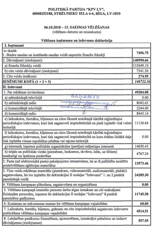 Politiskās partijas "KPV LV", reģ. Nr. 40008253188, 2018.gada 5.novembrī iesniegtā vēlēšanu ieņēmumu un izdevumu deklarācija