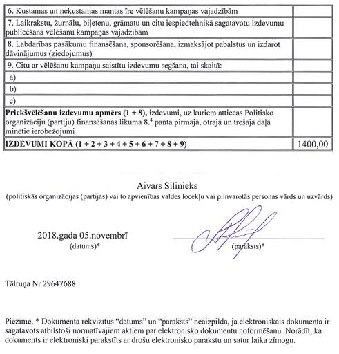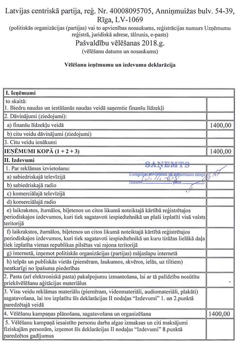 Politiskās partijas "Latvijas centriskā partija", reģ. Nr. 40008095705, 2018.gada 5.novembrī iesniegtā vēlēšanu ieņēmumu un izdevumu deklarācija