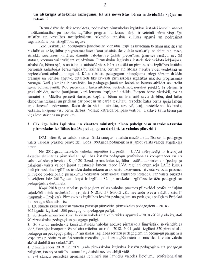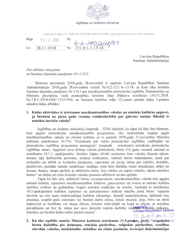 Deputāti Kabanovs, Pimenovs, Agešins, Dolgopolovs un Ādamsons ir iesnieguši jautājumu "Par mazākumtautību pirmsskolas izglītību". Jautājums pāradresēts izglītības un zinātnes ministra pienākumu izpildītājam. Saņemtā rakstveida atbilde iesniedzējus apmierina. Ministrs nevar ierasties uz mutvārdu atbildes sniegšanu, līdz ar to tā nenotiks.