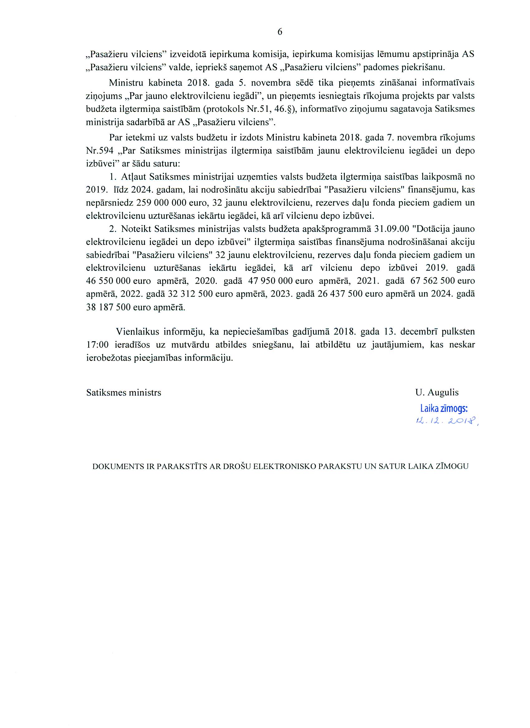 Godātie kolēģi, sēdes darba kārtība ir izskatīta. Bet saistībā ar šodien paredzēto atbilžu sniegšanu uz deputātu jautājumiem vēlos jūs informēt par deputātu Zariņa, Rubika, Urbanoviča, Tutina un Krišāna jautājumu satiksmes ministram Uldim Augulim "Par pasažieru vilcienu iepirkumu". Saņemtā rakstveida atbilde iesniedzējus apmierina, tāpēc atbilžu sniegšana uz deputātu jautājumiem šodien nenotiks.