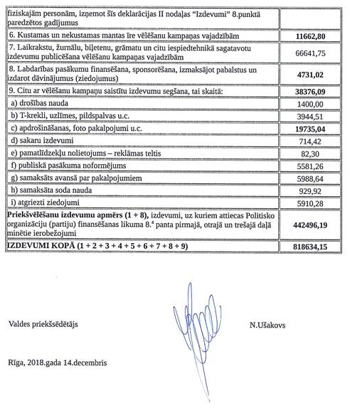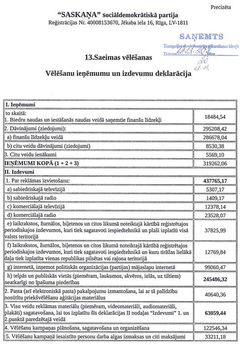 Politiskās partijas ""SASKAŅA" sociāldemokrātiskā partija", reģ. Nr. 40008153670, precizēta vēlēšanu ieņēmumu un izdevumu deklarācija