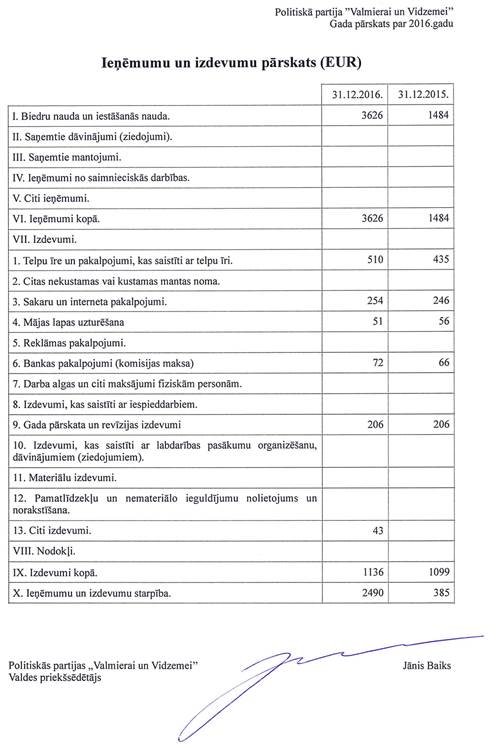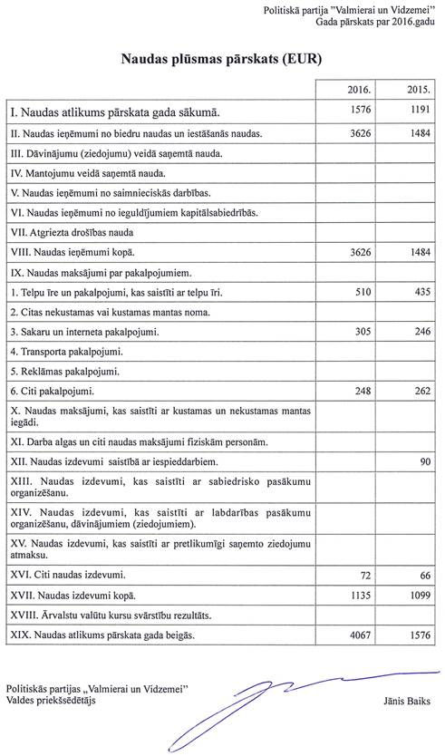 Politiskās partijas "Valmierai un Vidzemei", reģ. Nr. 40008196025, gada pārskats par 2016. gadu