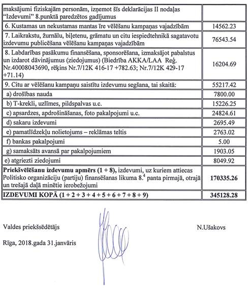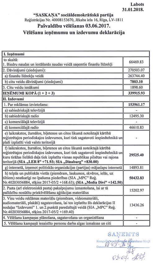 Politiskās partijas ""SASKAŅA" sociāldemokrātiskā partija", reģ. Nr. 40008153670, precizēta vēlēšanu ieņēmumu un izdevumu deklarācija