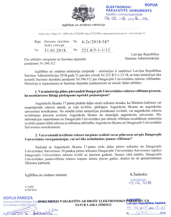 Sakarā ar rektora vēlēšanu izsludināšanas kavēšanu mums ir bijusi sarakste ar Daugavpils Universitāti, kur mēs esam informējuši par nepieciešamību atbilstoši Augstskolu likumam izsludināt vēlēšanas. Vēlēšanas tika izsludinātas un notika. Kad Izglītības un zinātnes ministrija saņems vēlēšanu materiālus, lai virzītu ievēlēto rektoru apstiprināšanai Ministru kabinetā, tad tiks izvērtēta vēlēšanu norises atbilstība Augstskolu likumam un Daugavpils Universitātes Satversmei, kā arī korespondence, ja tāda būs, attiecībā uz iespējamiem iesniegumiem, kuri varētu sekot.