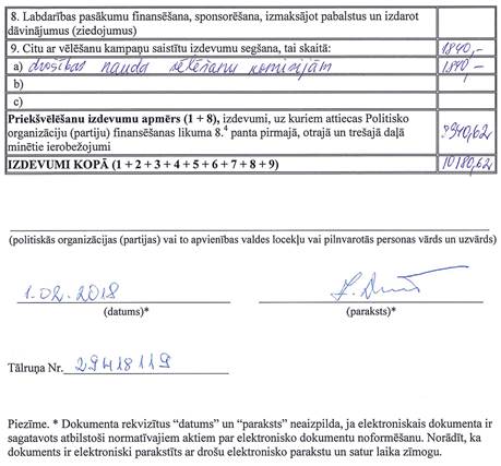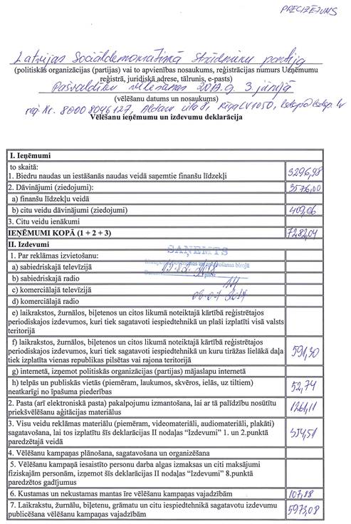 Politiskās partijas "Latvijas Sociāldemokrātiskā strādnieku partija", reģ. Nr. 80008046127, precizēta vēlēšanu ieņēmumu un izdevumu deklarācija