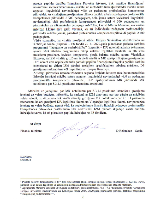 Tātad otrs jautājums, kuru esmu ieplānojis jums uzdot. Runa ir par to, ka Izglītības un zinātnes ministrija plāno pieteikties uz papildu līdzekļiem – nevis pārcelt no vienas programmas citā programmā, bet iegūt papildu līdzekļus. Jūs skaidrojāt, ka, lūk, būs līdzekļi no Eiropas Savienības fondiem. Es saprotu, ka tas neietekmēs budžetu. Bet, no otras puses, ir labi zināms: lai dabūtu jaunus līdzekļus no Eiropas, ir jānodrošina līdzfinansējums no valsts budžeta. Jūs rakstāt, ka visi līdzekļi, kurus plānots izmantot, budžetā jau ir ieplānoti. Tas nozīmē, ka tie, kas ir ieplānoti, tiks mērķtiecīgi izmantoti.