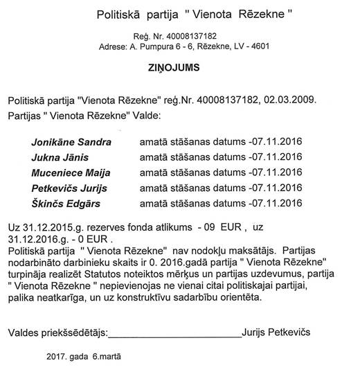 Politiskās partijas "Vienota Rēzekne", reģ. Nr.40008137182, precizēts gada pārskats par 2016.gadu