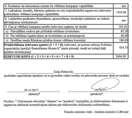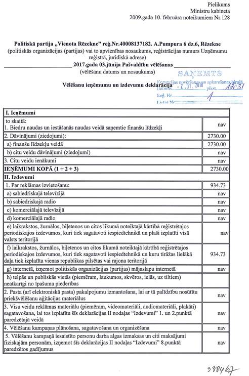 Politiskās partijas "Vienota Rēzekne", reģ. Nr. 40008137182, precizēta vēlēšanu ieņēmumu un izdevumu deklarācija