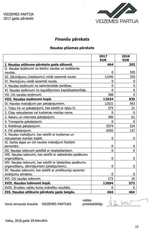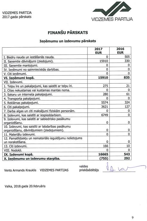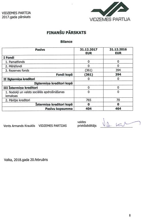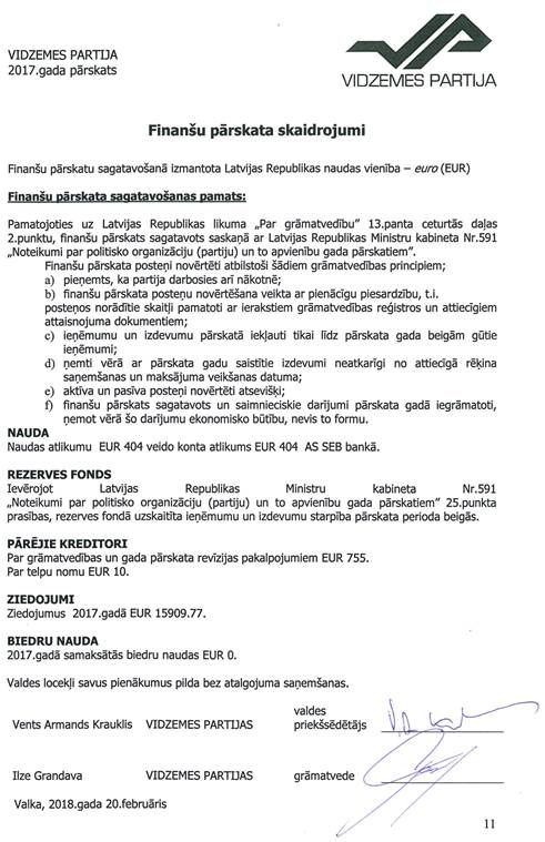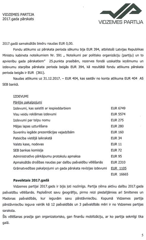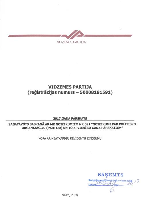 Politiskās partijas "VIDZEMES PARTIJA", reģ. Nr. 50008181591, gada pārskats par 2017.gadu