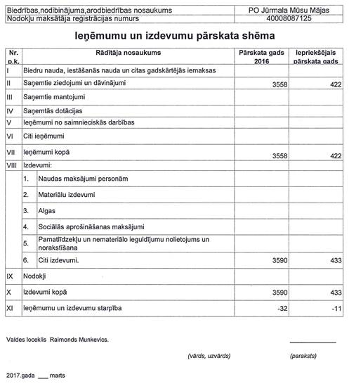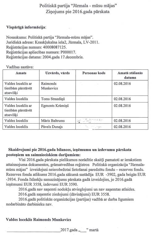 Politiskās partijas "Jūrmala - mūsu mājas", reģ. Nr.40008087125, precizēts gada pārskats par 2016.gadu