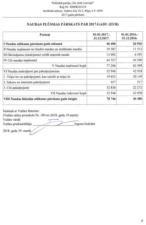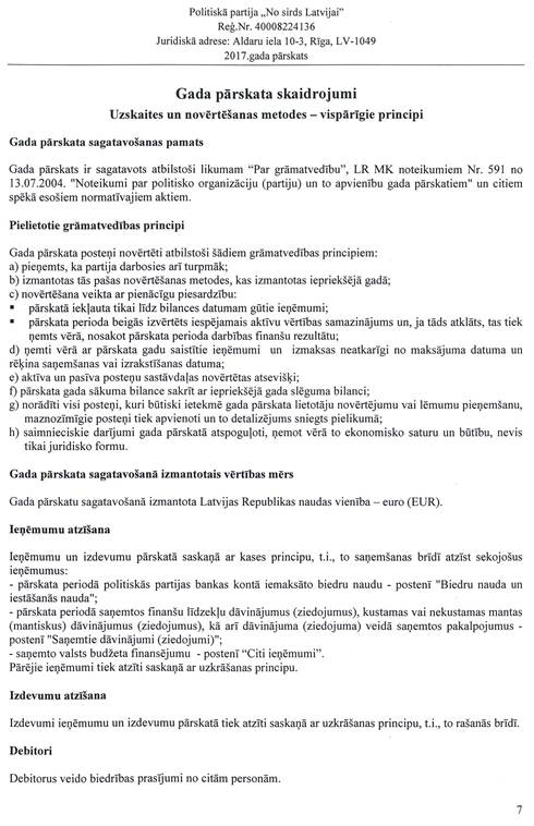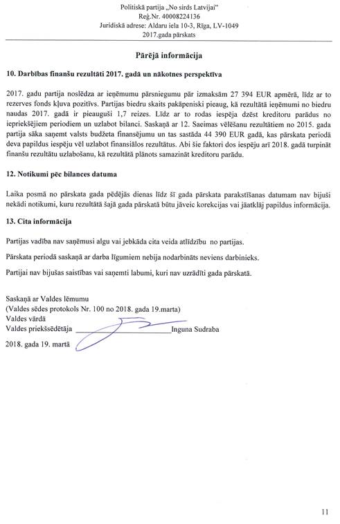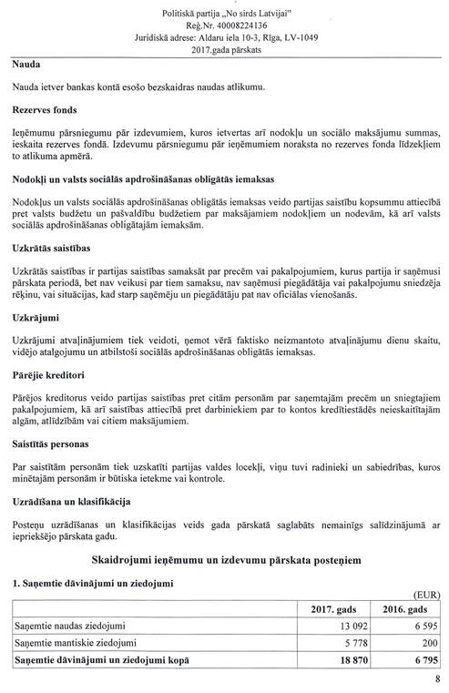 Politiskās partijas "No sirds Latvijai", reģ. Nr. 40008224136, gada pārskats par 2017.gadu