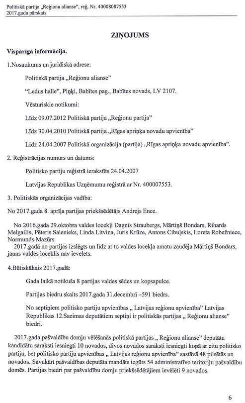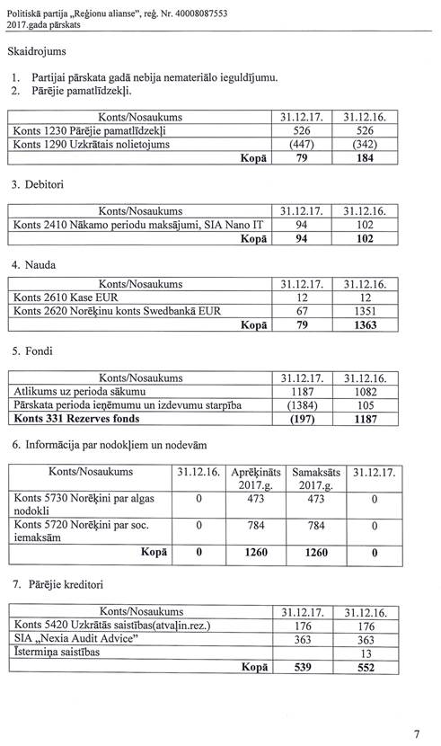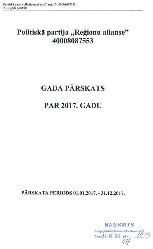 Politiskās partijas "Reģionu alianse", reģ. Nr. 40008087553, gada pārskats par 2017.gadu
