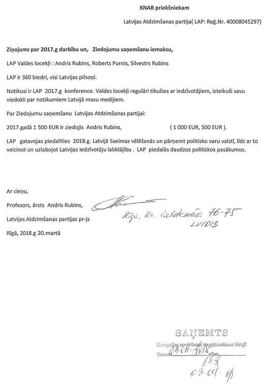 Politiskās partijas "Latvijas Atdzimšanas partija", reģ. Nr. 40008045297, gada pārskats par 2017.gadu