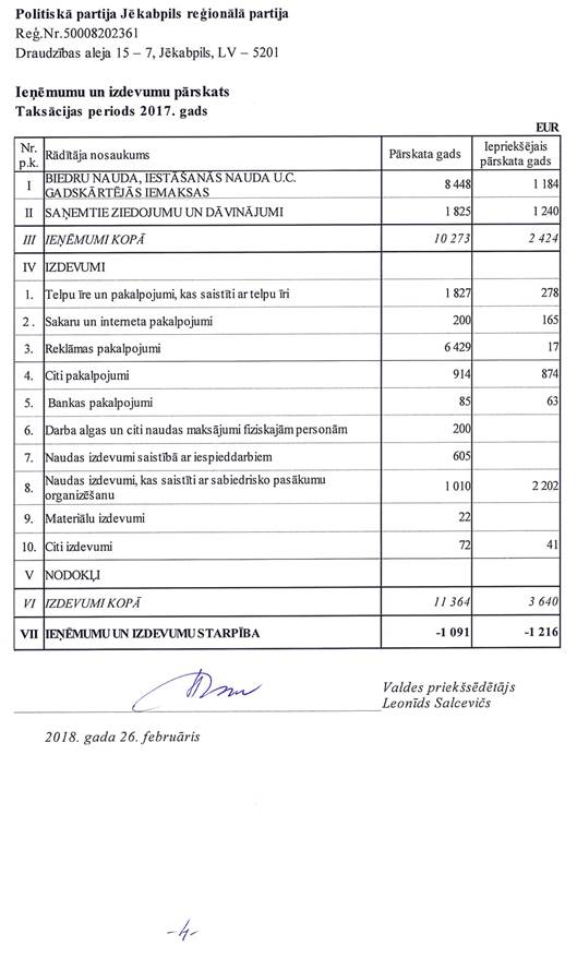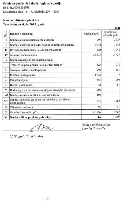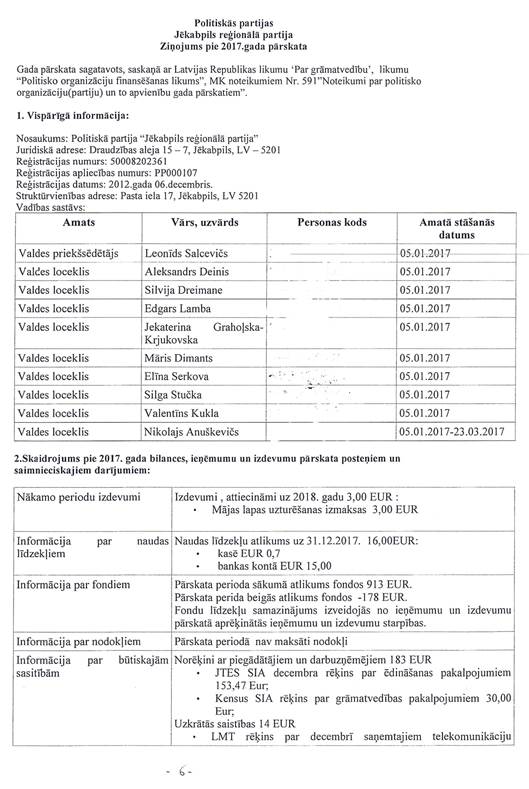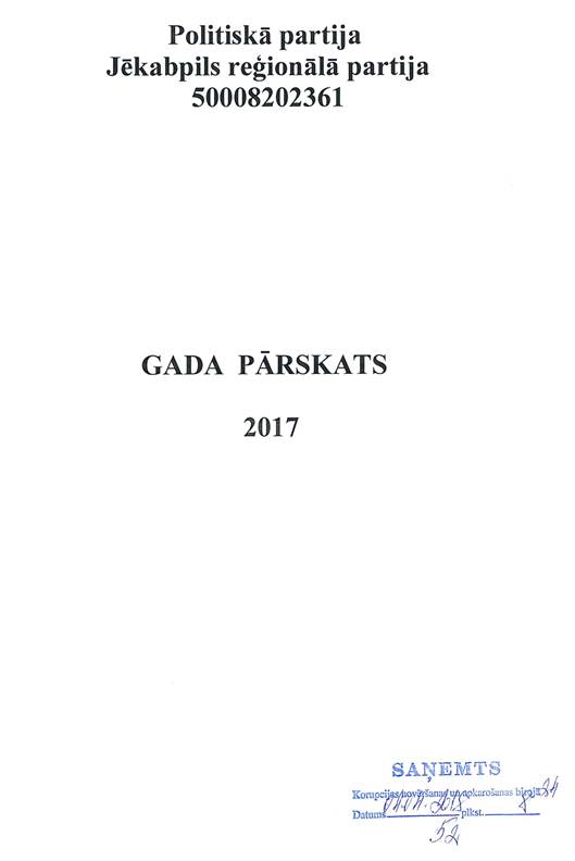 Politiskās partijas "Jēkabpils reģionālā partija", reģ. Nr. 50008202361, gada pārskats par 2017.gadu