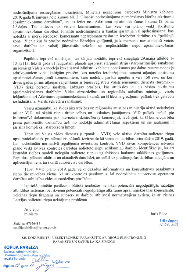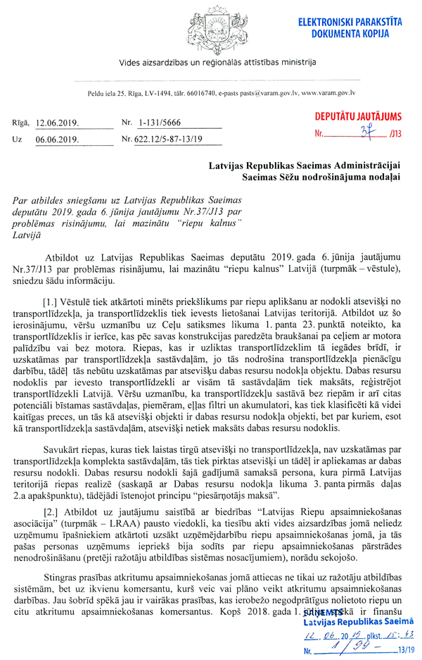 Par deputātu Reiznieces-Ozolas, Valaiņa, Čakšas, Jalinskas, Kučinska un Bergmaņa jautājumu vides aizsardzības un reģionālās attīstības ministram Jurim Pūcem "Par problēmas risinājumu, lai mazinātu "riepu kalnus" Latvijā". Saņemtā rakstveida atbilde iesniedzējus apmierina.