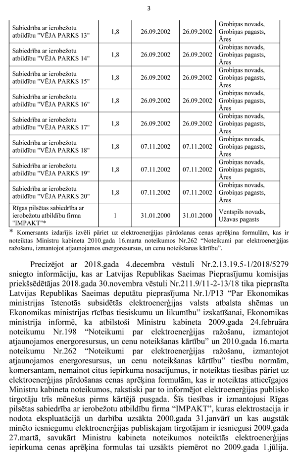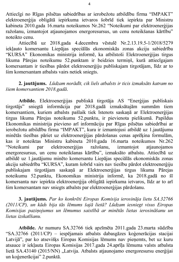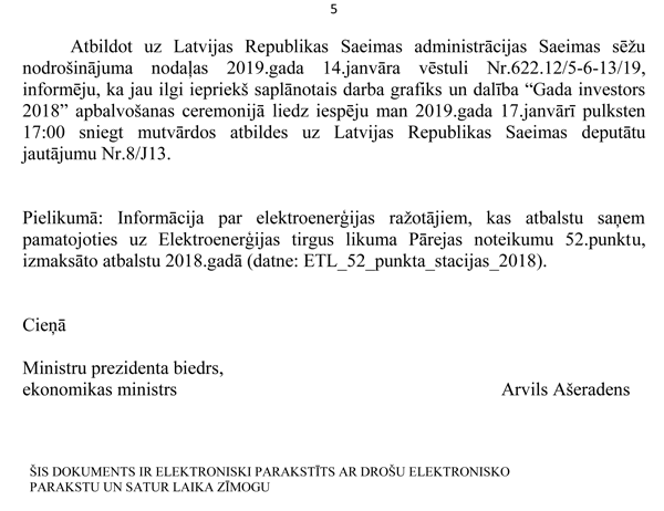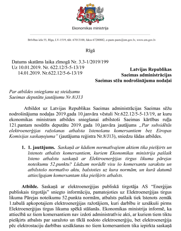 Saistībā ar šodien paredzēto atbilžu sniegšanu uz deputātu jautājumiem vēlos jūs informēt par deputātu Zariņa, Krišāna, Ločmeles-Luņovas, Agešina un Ādamsona jautājumu ekonomikas ministram Arvilam Ašeradenam "Par subsidētās elektroenerģijas ražošanas atbalsta īstenošanu komersantiem bez Eiropas Komisijas saskaņojuma". Saņemtā rakstveida atbilde iesniedzējus neapmierina, bet deputāti mutvārdos papildjautājumus uzdot nevēlas.