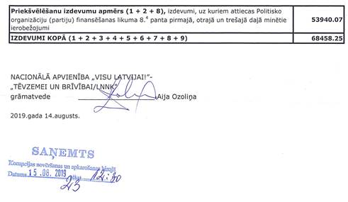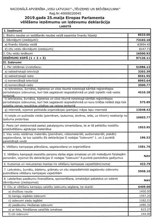 Politiskās partijas "Nacionālā apvienība "Visu Latvijai!"-"Tēvzemei un Brīvībai/LNNK"", reģ. Nr. 40008220045, precizēta Eiropas Parlamenta vēlēšanu ieņēmumu un izdevumu deklarācija