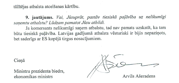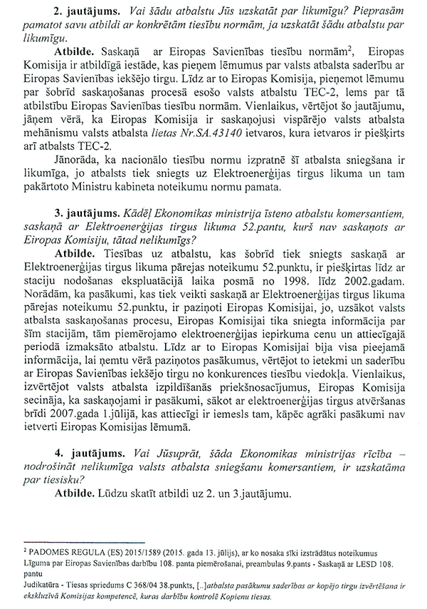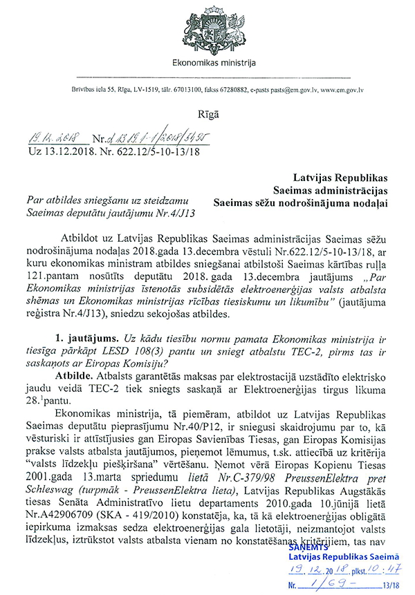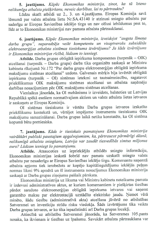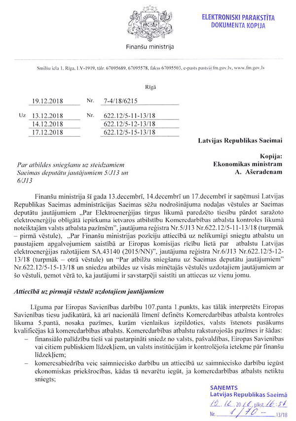 Par deputātu Zariņa, Krišāna, Orlova, Tutina un Rubika jautājumu finanšu ministrei Danai Reizniecei-Ozolai "Par Elektroenerģijas tirgus likumā paredzēto tiesību pārdot saražoto elektroenerģiju obligātā iepirkuma ietvaros atbilstību Komercdarbības atbalsta kontroles likumā noteiktajām valsts atbalsta pazīmēm" – saņemtā rakstveida atbilde iesniedzējus neapmierina. Ministre informē, ka saplānotā darba grafika dēļ nevar ierasties uz mutvārdu atbildes sniegšanu.