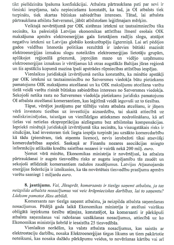 Lai cik šā likuma iecere un izpilde ir aplama, tā ir esošās nodokļu sistēmas organiska daļa; tā tūlītēja izņemšana no nodokļu sistēmas... 10 dienas pirms jaunā taksācijas gada sākuma radīs dobumu 42 miljonu eiro apmērā, kas pakļaus riskam sociālo programmu īstenošanu. Tomēr tuvākajā nākotnē solidaritātes nodoklis ir jāatceļ, lai atrisinātu tā uzdevumus sistēmiski, ekonomiski pamatoti un sociāli taisnīgi.