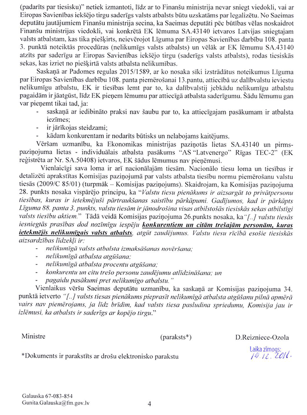 Par deputātu Zariņa, Agešina, Goldbergas, Švecovas un Pimenova jautājumu finanšu ministrei Danai Reizniecei-Ozolai "Par Finanšu ministrijas pozīciju attiecībā uz nelikumīgi sniegtu atbalstu un paustajiem apgalvojumiem saistībā ar Eiropas komisijas rīcību lietā par atbalstu Latvijas elektroenerģijas ražotājiem SA.43140 (2015/NN)" – saņemtā rakstveida atbilde iesniedzējus neapmierina. Ministre informē, ka iepriekš saplānotā darba grafika dēļ nevar ierasties uz mutvārdu atbildes sniegšanu.