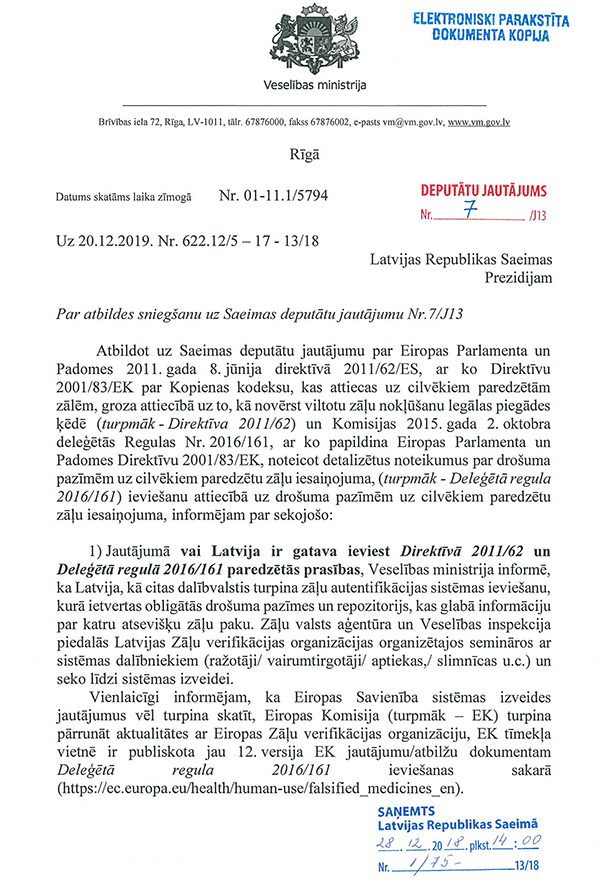Ir iesniegts deputātu jautājums. Deputāti Skride, Pavļuts, Pūce, Staķis un Bondars iesnieguši jautājumu "Par Viltoto zāļu direktīvas un regulas par drošuma pazīmēm uz cilvēkiem paredzētu zāļu iesaiņojuma ieviešanu".