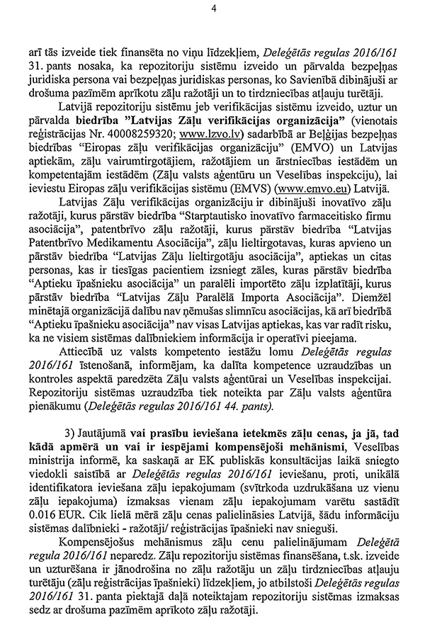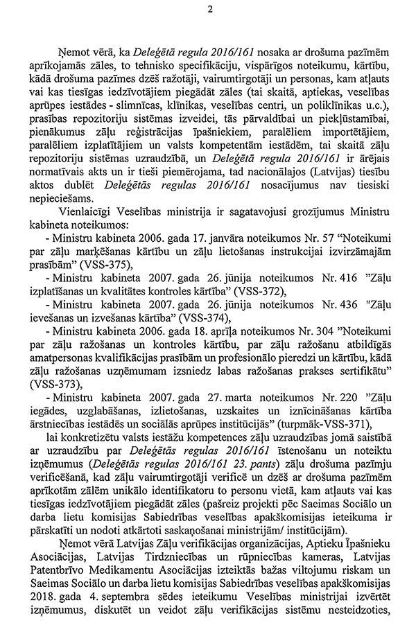 Kolēģi! Kā jau mēs... un arī citas partijas vasarā un rudenī norādīja, Latvijā šobrīd ir vienas no dārgākajām zālēm Eiropā. No nākamā gada 9. februāra sāks darboties Eiropas Savienības direktīva, kas paredz zāļu drošības pārbaudes regulējumu. Ņemot vērā neziņu un neskaidrības par direktīvas ieviešanas gaitu, kā arī zāļu ražotāju un tirgotāju gatavību nodrošināt šos marķējumus un nepieciešamās pārbaudes, sabiedrībā ir bažas un neziņa par zāļu pieejamību pēc šīs regulas stāšanās spēkā, kā arī par to, kā tas ietekmēs jau esošās augstās zāļu cenas.
