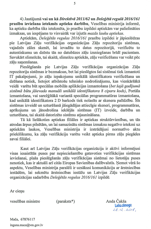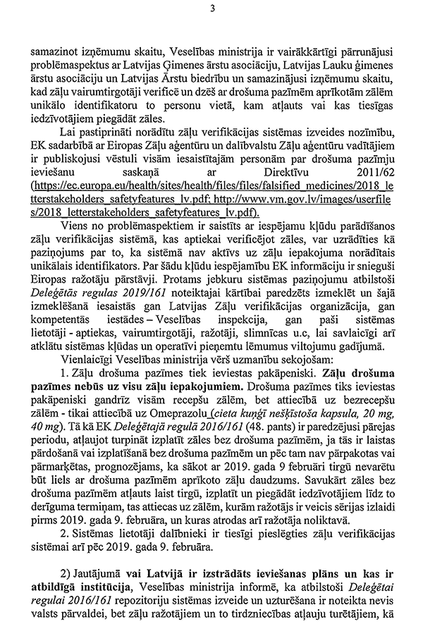 Tāpēc mēs lūdzam veselības ministri sniegt atbildes uz vēstulē uzdotajiem jautājumiem, lai varam attiecīgi reaģēt un steidzami risināt šo jautājumu.
