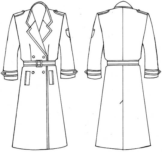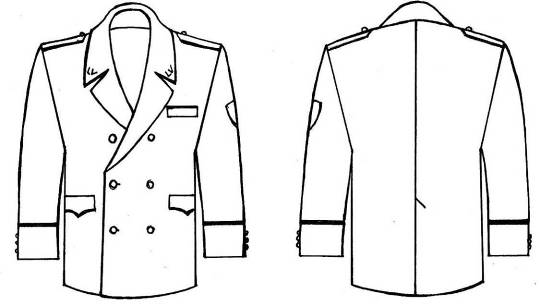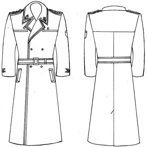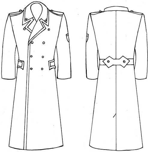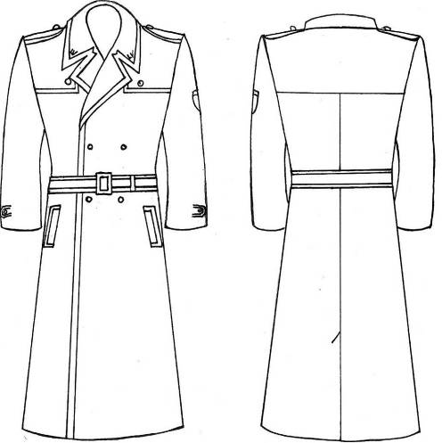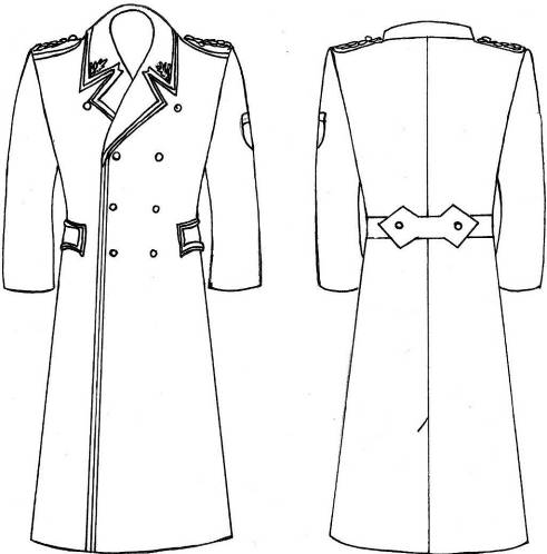8. Ģenerālim – mētelis ar divām iegrieztām sānu kabatām ar līstīti, nobīdīto divu pogu aizdari un četrām apdares pogām. Iešūtas divvīļu piedurknes. Uz plecu vīlēm – no zeltītiem diegiem pīti uzpleči ar apmalojumu karmīnsarkanā krāsā (Valsts robežsardzes ģenerāļa formas tērpam – gaiši zaļā krāsā) ar vienu pogu. Ģenerāļa iestādes vadītāja (izņemot iestādes padotībā esošas koledžas vadītāju) uzplečus var papildināt ar iestādes simboliku un ozollapām. Uz vidukļa līnijas cauri divām jostas cilpām izvērta josta ar sprādzi. Uz kreisās piedurknes – ar metalizētiem diegiem izšūta attiecīgās iestādes emblēma. Valsts robežsardzes amatpersonai uz labās piedurknes – struktūrvienības vai Valsts robežsardzes koledžas emblēma. Iešūta atlokāma apkakle, apkakles stūros – zīmotne divu zeltītu ozollapu veidā. Apkaklei un priekšējai aizdares malai apmalojums karmīnsarkanā krāsā (Valsts robežsardzes ģenerāļa formas tērpam – gaiši zaļā krāsā) (4. attēls).
