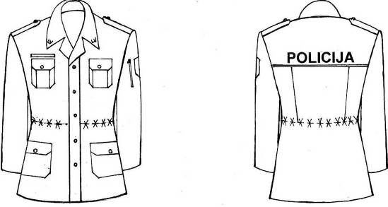 19. Taisna silueta žakete ar divām uzšūtām krūšu kabatām ar vienu pogu katrā pārlokā, divām iegrieztām sānu kabatām ar pārloku un divām iekškabatām. Priekšpuse ar vienrindas četru pogu aizdari. Virs labās krūšu kabatas – personas identifikācijas zīme (izņemot Ieslodzījuma vietu pārvaldi), Valsts robežsardzes Aviācijas pārvaldes Aviācijas dienesta un Aviācijas inženiertehniskā dienesta amatpersonai virs kreisās krūšu kabatas – Valsts robežsardzes Aviācijas pārvaldes Aviācijas dienesta un Aviācijas inženiertehniskā dienesta atpazīšanas zīme, bet Iekšējās drošības biroja amatpersonai virs kreisās krūšu kabatas – Iekšējās drošības biroja atpazīšanas zīme. Iešūta apkakle ar atlokiem. Iešūtas vienvīles piedurknes ar trim apdares pogām. Uz plecu vīlēm – uzpleči ar vienu pogu un dienesta pakāpes zīmēm. Valsts ugunsdzēsības un glābšanas dienesta amatpersonu formas tērpam uzpleču un apkakles apmales līdz atlokiem apstrādātas ar apmalojumu karmīnsarkanā krāsā. Uz kreisās piedurknes – iestādes emblēma. Valsts robežsardzes amatpersonām uz labās piedurknes – struktūrvienības vai Valsts robežsardzes koledžas emblēma. Iekšējās drošības biroja amatpersonām uz labās piedurknes – uzšuve ar izšūtu Latvijas Republikas karoga attēlu un uzrakstu "LATVIJA". Apkakles stūros – zīmotne "LV", Valsts robežsardzei – zīmotne stilizēta burta R veidā (15. attēls).