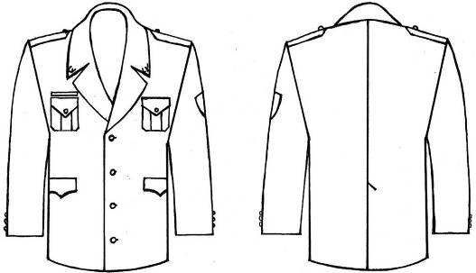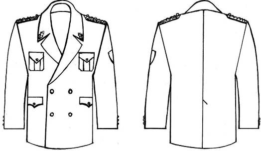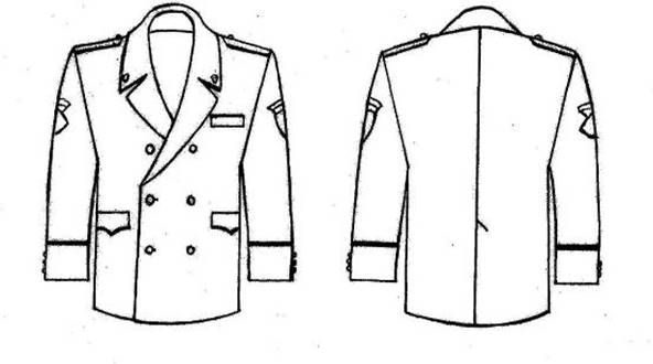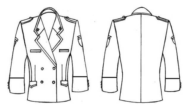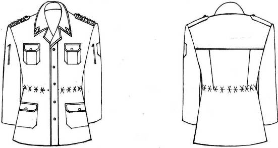 20. Ģenerālim – taisna silueta žakete ar nobīdīto divu pogu aizdari un divām apdares pogām, divām uzšūtām krūšu kabatām ar pārloku, divām iegrieztām sānu kabatām ar aizpogājamu pārloku un divām iekškabatām. Mugurpuse ar vīli un šķēlumu. Iešūta apkakle ar atlokiem. Iešūtas vienvīles piedurknes ar trim apdares pogām, uzpleči ar vienu pogu. Uz plecu vīlēm – no zeltītiem diegiem pīti uzpleči ar apmalojumu karmīnsarkanā krāsā (Valsts robežsardzes ģenerāļa formas tērpam – gaiši zaļā krāsā) ar vienu pogu, apkakles apmales līdz atlokiem, kā arī krūšu un sānu kabatu pārloki apstrādāti ar apmalojumu karmīnsarkanā krāsā (Valsts robežsardzes ģenerāļa formas tērpam – gaiši zaļā krāsā). Ģenerāļa iestādes vadītāja (izņemot iestādes padotībā esošas koledžas vadītāju) uzplečus var papildināt ar iestādes simboliku un ozollapām. Uz kreisās piedurknes – iestādes emblēma. Valsts robežsardzes amatpersonām uz labās piedurknes – struktūrvienības vai Valsts robežsardzes koledžas emblēma. Apkakles stūros – zīmotne divu zeltītu ozollapu veidā (16. attēls).