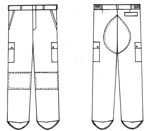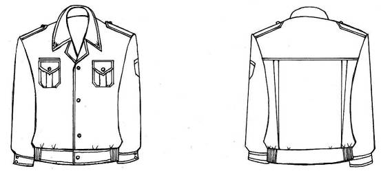 18. Taisna silueta virskrekls ar vienrindas piecu pogu aizdari pa aizdarsloksni un vienu pogu uz apkakles stāvdaļas, divām uzšūtām krūšu kabatām ar divām pogām katrā pārlokā. Uz plecu vīlēm – uzpleči ar vienu pogu. Iešūtas divvīļu garās piedurknes ar elkoņu vietā uzšūtiem pastiprinājumiem no tāda paša auduma. Virs labās krūšu kabatas – personas identifikācijas zīme. Valsts robežsardzes Aviācijas pārvaldes Aviācijas dienesta un Aviācijas inženiertehniskā dienesta amatpersonai virs kreisās krūšu kabatas – Valsts robežsardzes Aviācijas pārvaldes Aviācijas dienesta un Aviācijas inženiertehniskā dienesta atpazīšanas zīme. Uz kreisās piedurknes Valsts robežsardzes emblēma, uz labās – struktūrvienības vai Valsts robežsardzes koledžas emblēma. Bikses ar rāvējslēdzēja aizdari. Uz jostas – septiņas cilpas, sānos divi savilktņi. Priekšpusē – divas iegrieztas sānu kabatas. Ceļgalu vietā uzšūti pastiprinājumi no tāda paša auduma. Bikšu staru sānu daļā – divas uzšūtas kabatas ar pārloku, aizpogājamas ar divām pogām. Mugurpuses labajā pusē – viena iegriezta kabata ar pārloku, aizpogājama ar divām pogām. Mugurpusē uzšūts bikšu sēdvietas pastiprinājums no tāda paša auduma. Pie bikšu galiem piešūtas regulējamas cilpas (14. attēls).
