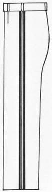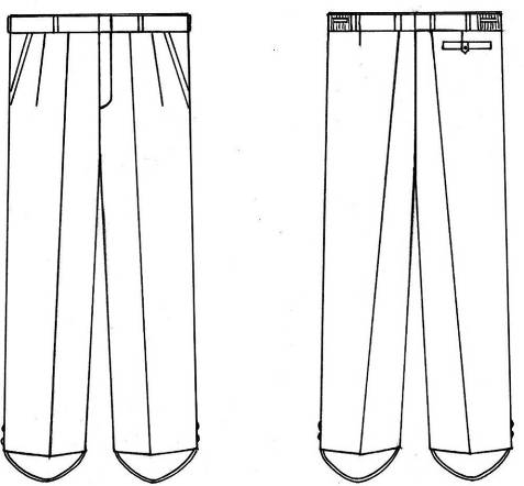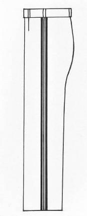 25. Ģenerālim – bikses ar piešūtu jostu vidukļa līnijā, rāvējslēdzēja aizdari priekšpusē (vidus vīlē). Uz jostas – astoņas cilpas un divi savilktņi. Priekšpuse ar divām ielocēm (pa vienai katrā pusē) un divām ieslīpām kabatām. Mugurpuse ar divām iešuvēm un vienu iegriezto kabatu ar cilpu un pogu. Bikšu ārējās vīlēs no karmīnsarkana (Valsts robežsardzes ģenerāļa formas tērpam – gaiši zaļa) auduma iešūtas iekantes un divi plati uzšuvumi (21. attēls).
