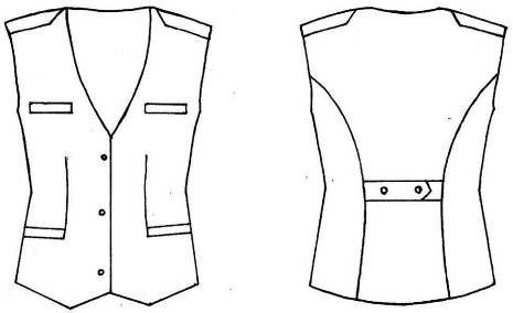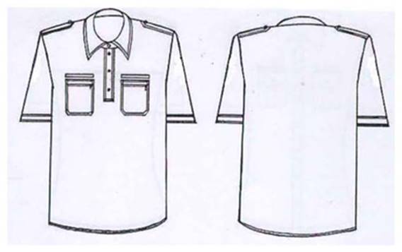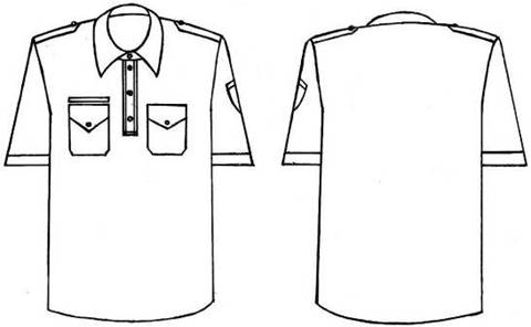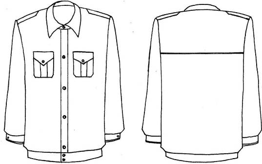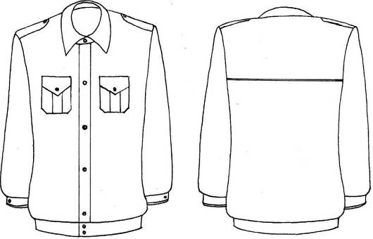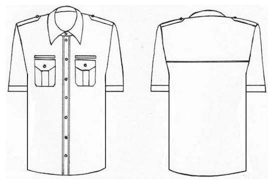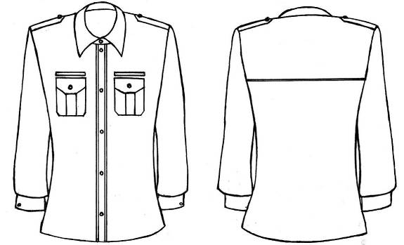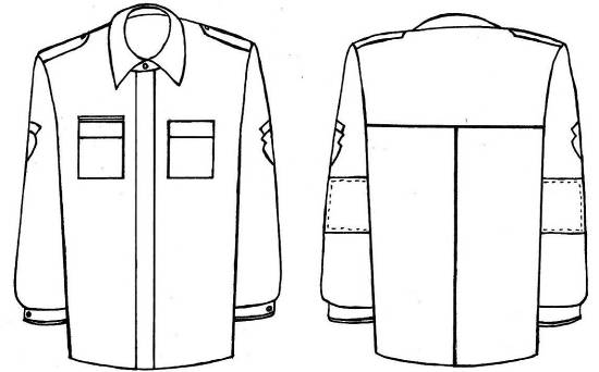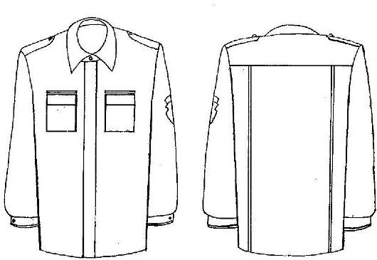 17. Pieguloša silueta virskrekls ar vienrindas piecu pogu aizdari pa aizdarsloksni un vienu pogu uz apkakles stāvdaļas, divām uzšūtām krūšu kabatām ar vienu pogu katrā pārlokā, uzpleču pārvalkiem un īsām vai garām piedurknēm. Mugurpuse ar piešūtu atdaļu. Virs labās krūšu kabatas – personas identifikācijas zīme (izņemot Ieslodzījuma vietu pārvaldi). Iešūta apkakle ar atsevišķi piegrieztu stāvdaļu. Uz kreisās piedurknes – iestādes emblēma (izņemot Ieslodzījuma vietu pārvaldi). Apkakles stūros – zīmotne "LV" (izņemot Ieslodzījuma vietu pārvaldi) (13. attēls).