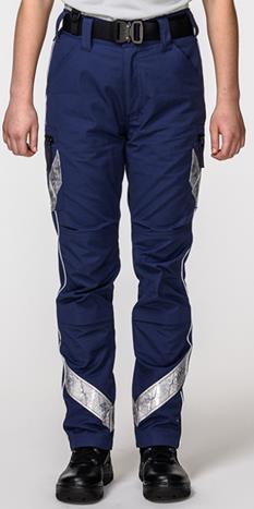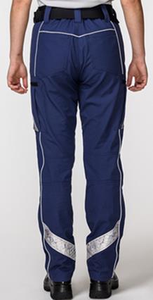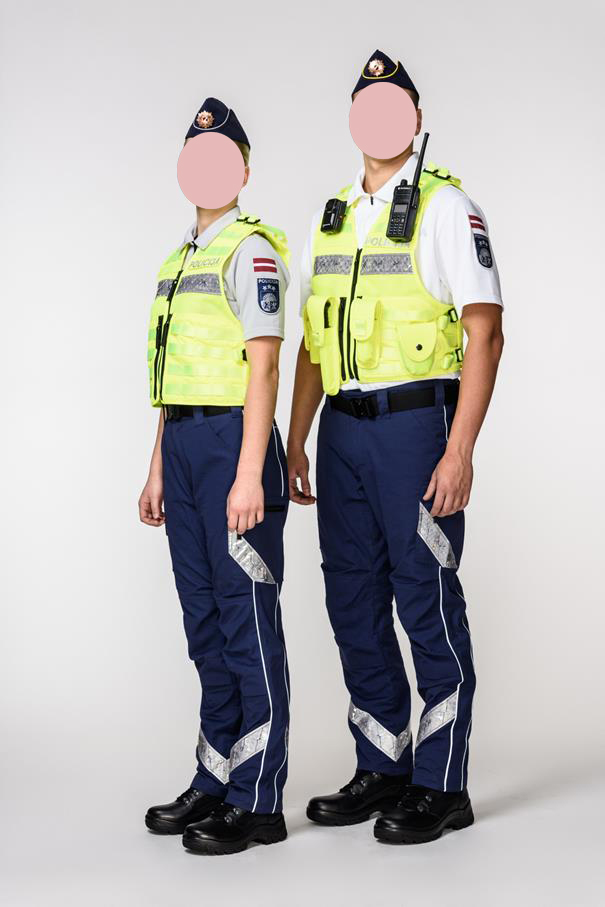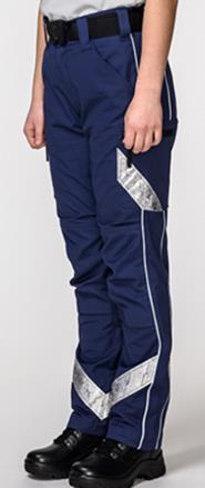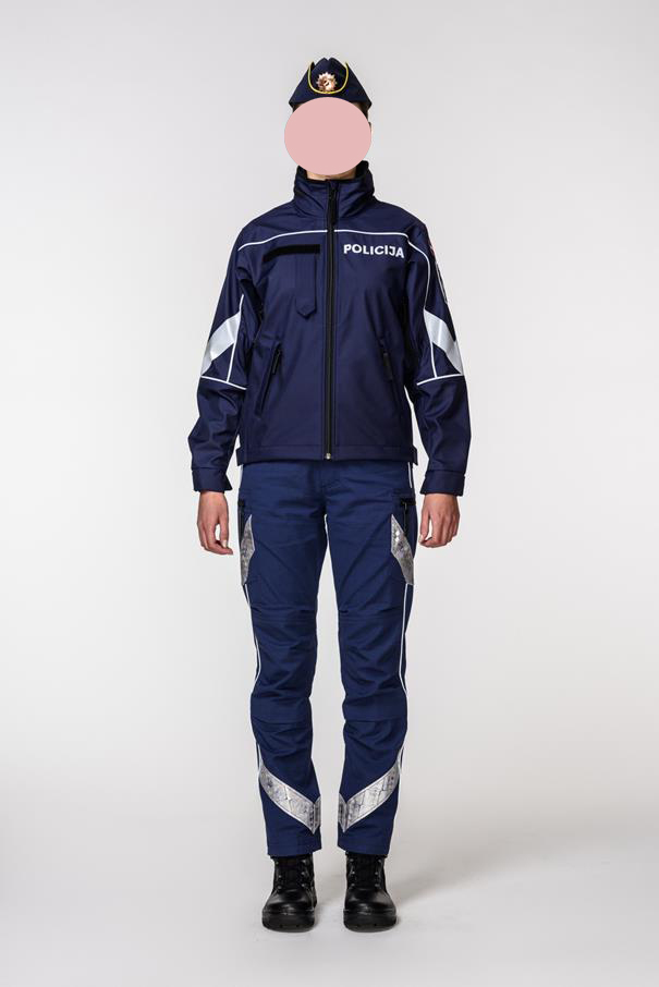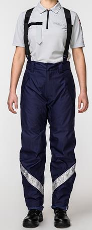 4. Viegla auduma vai blīva auduma bikses – viegla vai blīva auduma brīvas formas bikses (16.–18. attēls) tumši zilā krāsā. Staru sānos un galos gaismu atstarojoša lente ar uzrakstu "POLICIJA".