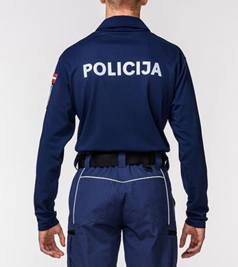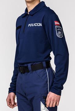 2. Polo krekls ar garām piedurknēm – polo krekls (10.–12. attēls) tumši zilā, pelēkā vai baltā krāsā. Priekšdaļā kreisajā pusē krūšu līmenī uzraksts "POLICIJA". Priekšdaļā labajā pusē krūšu līmenī personas identifikācijas zīme, zem tās – dienesta pakāpes zīme. Muguras daļā gaismu atstarojošs uzraksts "POLICIJA". Uz kreisās piedurknes Latvijas valsts karoga emblēma, zem tās – Valsts policijas emblēma.