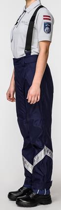 5. Lietus bikses – ūdensnecaurlaidīgas brīvas formas lenču bikses (19.–21. attēls) tumši zilā krāsā ar paaugstinājumu muguras centrā. Staru galos gaismu atstarojoša lente ar uzrakstu "POLICIJA".
