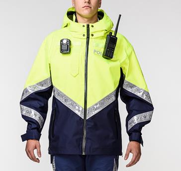 22. attēls. Lietus jaka tumši zilā un augstas redzamības dzeltenā krāsā. Priekšpuse