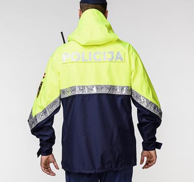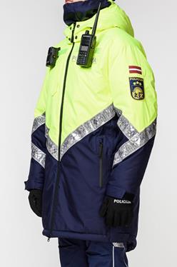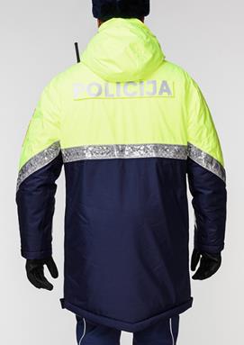 7. Ziemas jaka – ūdensnecaurlaidīga siltināta virsjaka ar kapuci (25.–27. attēls) augstas redzamības dzeltenā vai tumši zilā un augstas redzamības dzeltenā krāsā. Priekšdaļā, muguras daļā un uz piedurknēm gaismu atstarojoša lente ar uzrakstu "POLICIJA". Priekšdaļā kreisajā pusē krūšu līmenī gaismu atstarojošs uzraksts "POLICIJA". Priekšdaļā labajā pusē krūšu līmenī personas identifikācijas zīme, zem tās – dienesta pakāpes zīme. Muguras daļā gaismu atstarojošs uzraksts "POLICIJA". Uz kreisās piedurknes Latvijas valsts karoga emblēma, zem tās – Valsts policijas emblēma.
