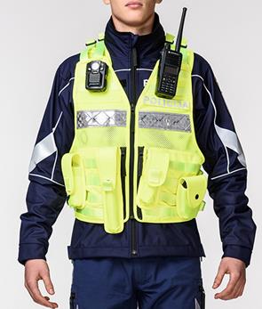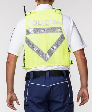 8. Modulārā uzkabes veste – regulējama garuma un platuma uzkabes veste (28.–30. attēls) augstas redzamības dzeltenā krāsā. Priekšdaļā kreisajā pusē krūšu līmenī gaismu atstarojošs uzraksts "POLICIJA". Priekšdaļā labajā pusē krūšu līmenī personas identifikācijas zīme, zem tās – dienesta pakāpes zīme. Priekšdaļā krūšu līmenī, aizmugures daļā – lāpstiņu līmenī gaismu atstarojoša lente ar uzrakstu "POLICIJA". Veste papildināma ar uzkabes sistēmā iestiprināmām daudzfunkcionālām kabatām – luktura kabatu, gāzes baloniņa kabatu, rokudzelžu kabatu un steka kabatu –, kā arī taktisko uzkabes jostu ekipējuma izvietošanai.