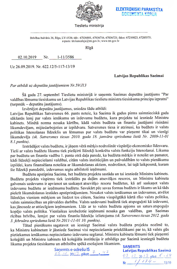 Deputātu Zariņa, Krišāna, Rubika, Ribakova un Orlova jautājums tieslietu ministram Jānim Bordānam "Par tiesiskuma principu un likumības principu". Saņemtā rakstveida atbilde iesniedzējus neapmierina, bet mutvārdos viņi papildjautājumus uzdot nevēlas.
