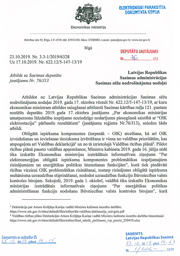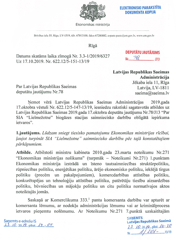 Deputātu Liepiņas, Šmita, Stepaņenko, Sprūdes un Gobzema jautājums ekonomikas ministram Ralfam Nemiro "Par SIA "Lielmežotne" biogāzes stacijas saimniecisko darbību obligātā iepirkuma ietvaros". Saņemtā rakstveida atbilde iesniedzējus apmierina.