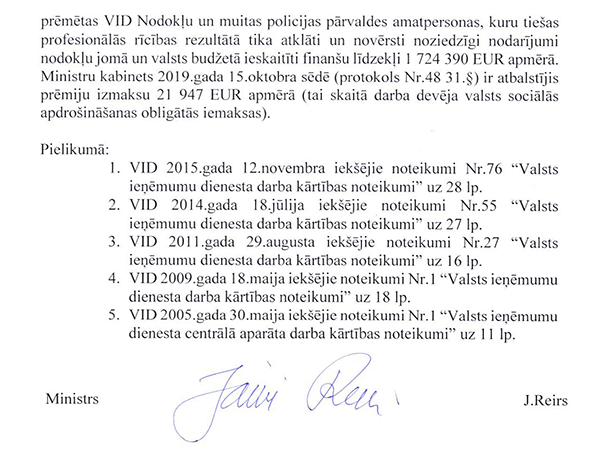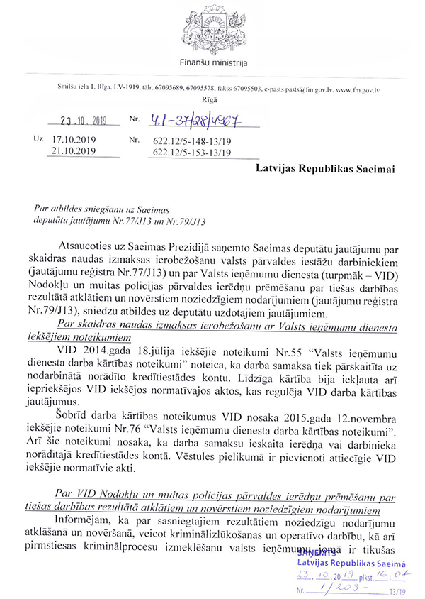 Deputātu Liepiņas, Šmita, Sprūdes, Stepaņenko un Gobzema jautājums finanšu ministram Jānim Reiram "Par Valsts ieņēmumu dienesta Nodokļu un muitas policijas pārvaldes ierēdņu prēmēšanu par tiešas darbības rezultātā atklātiem un novērstiem noziedzīgiem nodarījumiem". Saņemtā rakstveida atbilde iesniedzējus neapmierina, bet mutvārdos papildjautājumus viņi uzdot nevēlas.