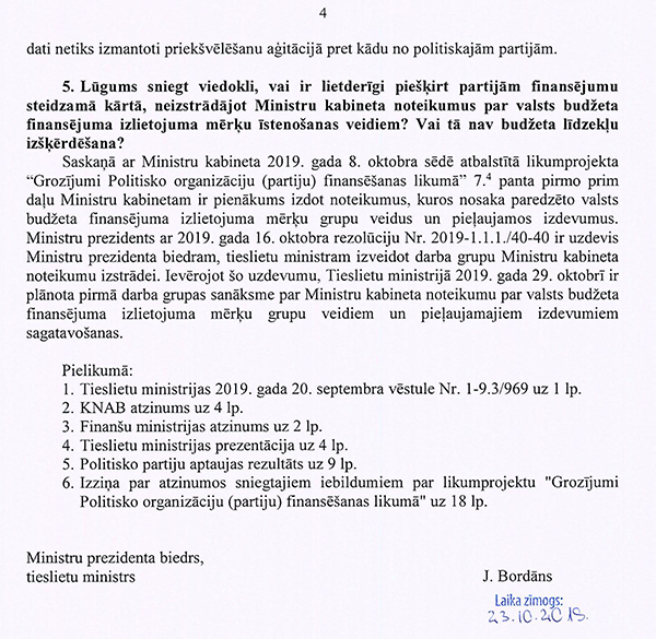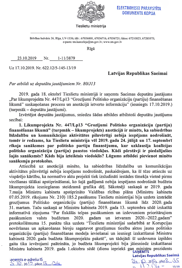 Deputātu Stepaņenko, Gobzema, Šmita, Sprūdes un Liepiņas jautājums tieslietu ministram Jānim Bordānam "Par likumprojekta Nr. 447/Lp13 "Grozījumi Politisko organizāciju (partiju) finansēšanas likumā" saskaņošanas procesu un anotācijā ietverto informāciju". Saņemtā rakstveida atbilde iesniedzējus neapmierina, bet mutvārdos papildjautājumus viņi uzdot nevēlas.
