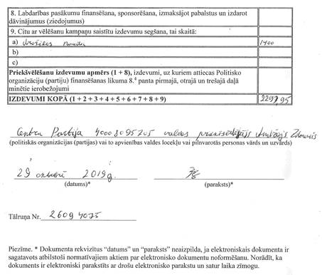 Politiskās partijas "Centra Partija", reģ. Nr. 40008095705, 2019.gada 25.maija Eiropas Parlamenta vēlēšanu ieņēmumu un izdevumu deklarācija