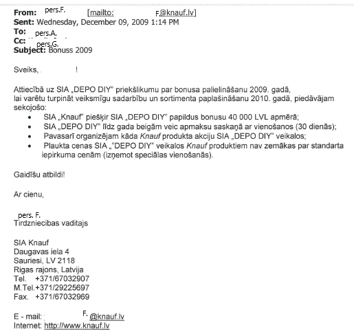 22 Vienlaikus paskaidrojumos tiesā par e-pastu Nr. 48 [pers. A] jau konkrēti skaidro šī e-pasta saturu. Uz jautājumu par 09.12.2009. e-pasta plkst. 1.14 PM saturā norādītā uzskaitījuma 2. un 4. punktu, [pers. A] paskaidrojis, ka "40 000, jā, tas ir tas bonuss, kas ir minēts tai protokolā. Bet tas 4. punkts – nē, par to vienošanās nebija. To viņš [KP piezīme – e-pasta nosūtītājs pers. F] acīmredzot tā to bija sapratis. Knauf regulāri izteic vēlmi, lai mēs savas pārdošanas cenas pēc iespējas nesamazinām un turam pēc iespējas augstākas. Taču mēs katru reizi teicām, ka viņas, neatkarīgi no viņu vēlmēm, būs noteiktas tikai saskaņā ar mūsu pārdošanas cenām. Nu šajā brīdī viņš [KP piezīme – e-pasta nosūtītājs pers. F] acīmredzot pierakstīja to kā savu vēlmi, lai viņas [KP piezīme – plaukta cenas] nav zemākas par iepirkuma cenām, kas ir pavadzīmes cenas."