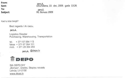 Depo labojumi – [pers. A] nav sapratis tekstu [kas norādīts 09.12.2009. e-pastā plkst. 1.14 PM]. Balstoties uz to, ko es uzrakstīju, es to nesapratu. Visdrīzāk es nesapratu visvairāk to pēdējo punktu. Kas par speciālo vienošanos un kāpēc vispār ir tāda prasība, lai mēs pieturamies pie cenām, kas nav zem iepirkuma cenām [..] – es gribēju to pārrunāt. [..] Es tālāk nezinu, kas tur bija. Es neatceros, kas tieši šajā gadījumā, par ko tika runāts un par ko tieši mēs vienojāmies vai nevienojāmies. Un attiecībā uz 2. e-pastu [09.12.2009. e-pasts plkst. 11.33 PM] [pers. A] var pateikt tikai to, kas tur rakstīts. [pers. E] nepatīk pēdējais punkts, jo dažām precēm cenas ir zemākas. Visdrīzāk tas nozīmē to, ka tās pārdošanas cenas ir zemākas par iepirkuma cenām. Acīmredzot tas nozīmē, ka tas ir atgādinājums man par mūsu pārcenošanas cenu politiku. Tikai to es varu šobrīd uztaisīt pieņēmumu vai minēt, ko neko citu [pers. E] nevarēja atklāti norādīt. Šajā gadījumā viņš arī norādīja, piegādātājs vēlas ierobežot mūsu pārdošanas cenas, vajag pārrunāt. Pārrunāt nozīmē mainīt vai nevienoties. |