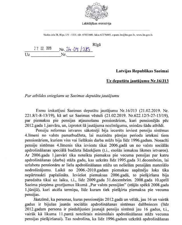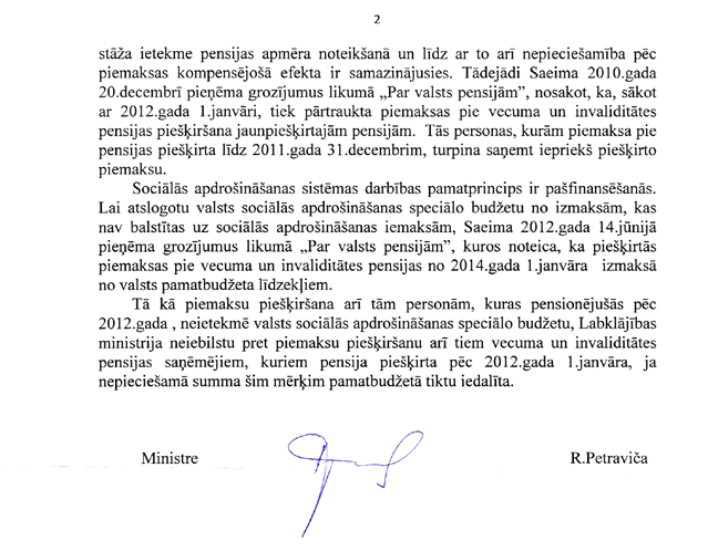 Ministres kundze, vēlreiz izlasot mūsu jautājumu un jūsu sniegto atbildi, tomēr rodas papildu jautājums, kuru es vēlos uzdot. Ņemot vērā to, ka Latvijā šogad vidējā pensija ir 324 eiro, tas nozīmē, ka aptuveni puse no pensionāriem saņem daudz mazāk par šo summu. Tātad pensionāri ir viena no mazaizsargātajām sabiedrības grupām. Starptautiskie eksperti no OECD savās rekomendācijās Latvijai rekomendē – nekavējoties jāpievēršas pensiju sistēmas uzlabošanai un jāpalielina minimālās pensijas.