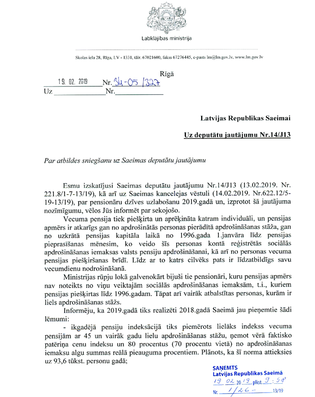 Sēdes vadītāja. Vai jums ir kāda speciāla atbilde uz jautājumu "Par likumdošanas iniciatīvām pensionāru dzīves līmeņa uzlabošanai", kas ir iesniegts šā gada 13. februārī? Nav.
