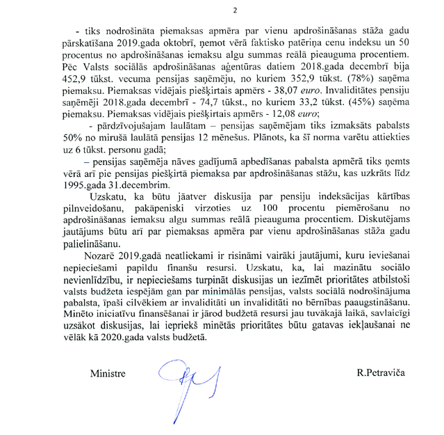 R. Petraviča. 2019. gads... Ir tehniskais budžets, un mēs varam atļauties tikai pensiju indeksāciju. Un 2019. gadā ir realizējamas tās iniciatīvas, kas jau ir no 2018. gada. Bet, runājot par turpmākajiem gadiem, mēs esam izskatījuši, kādā veidā varbūt varētu mainīt gan pensiju indeksāciju, gan arī piemaksu par nostrādātajiem gadiem, kas ir 1,50 eiro vai viens eiro. Esam arī aprēķinājuši, cik tas izmaksātu, ja mēs visiem palielinātu uz 1,50 eiro, kā arī, cik tas maksātu, ja mēs šo piemaksu rēķinātu visiem, nevis tikai tam personu lokam... līdz 2012. gadam...