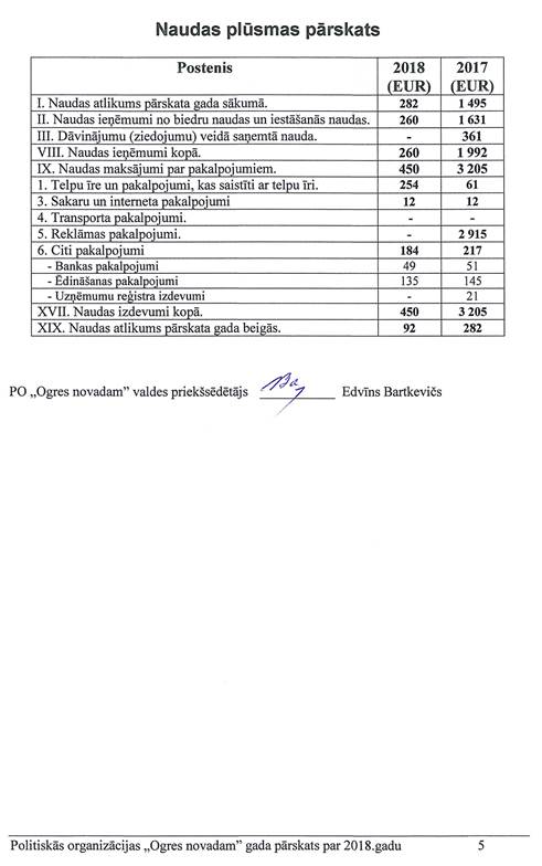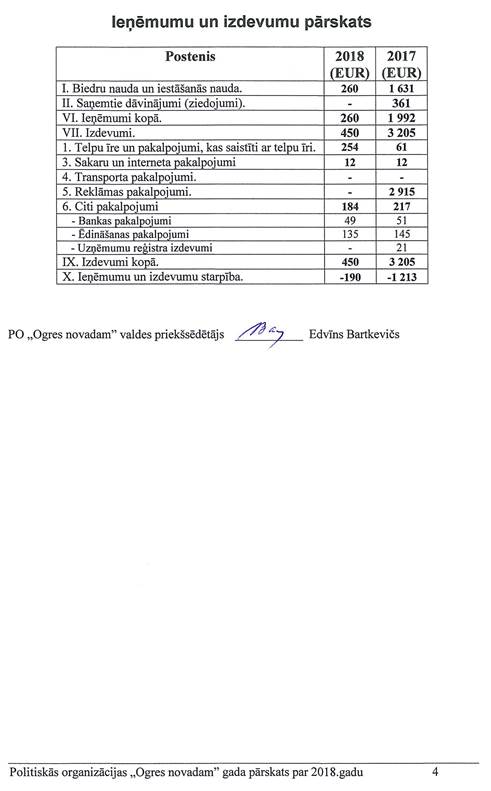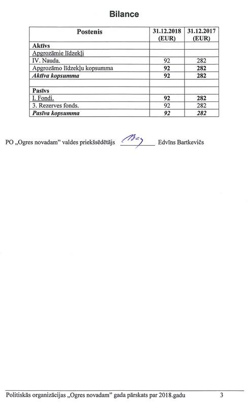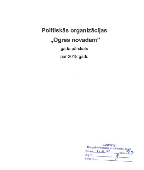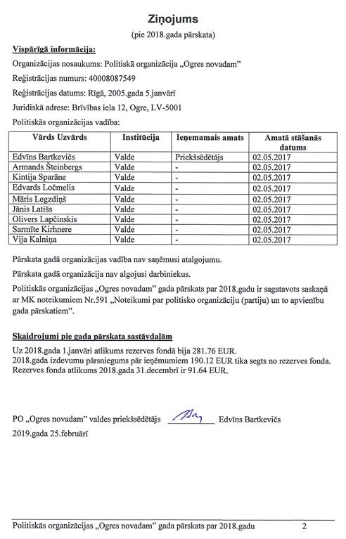 Politiskās partijas "Ogres novadam", reģ. Nr. 40008087549, gada pārskats par 2018.gadu